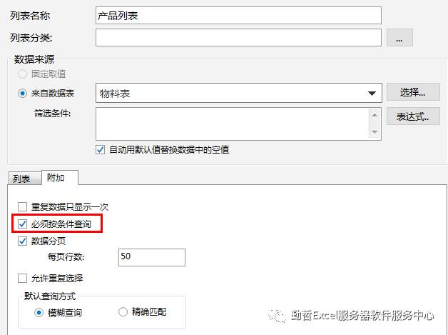 用法:在“附加”书签里面,勾选“必须按条件查询”。