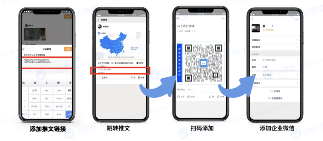 原本视频号发布的短视频下面,只支持放公众号的文章链接。你点进去文章链接,还要扫码加客服微信,还要等他发课程链接,才能点进去下单,这个过程如下图:
