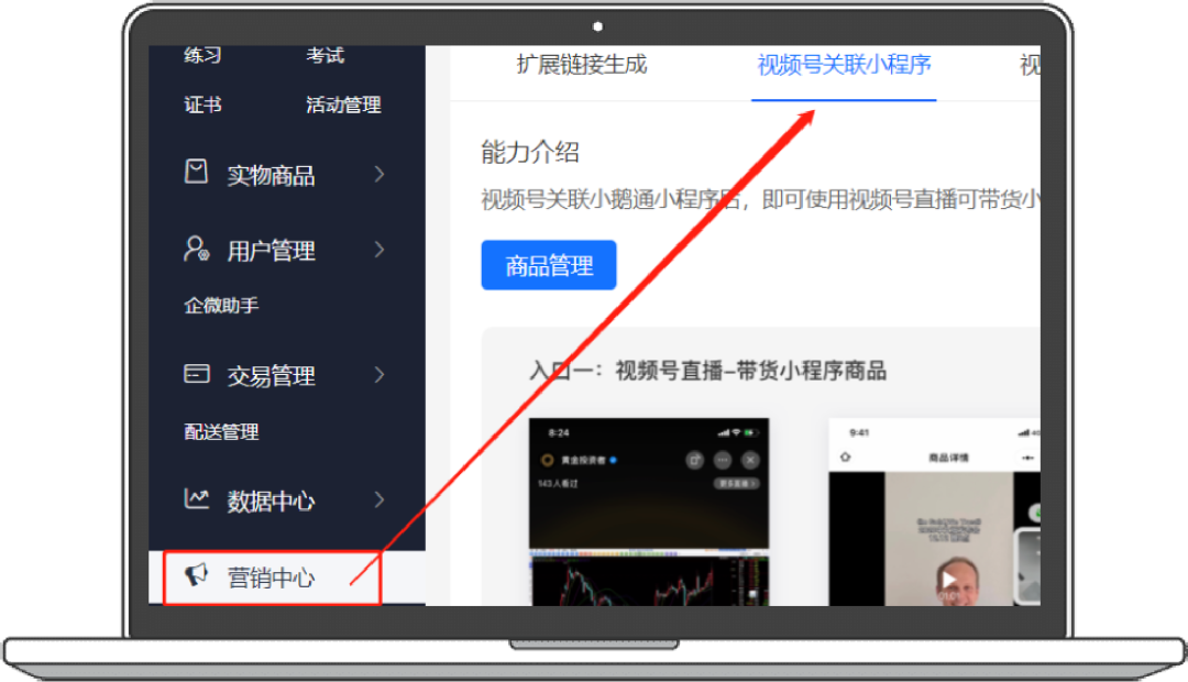 找到【营销中心-微信视频号】,咨询专属服务管家开通。