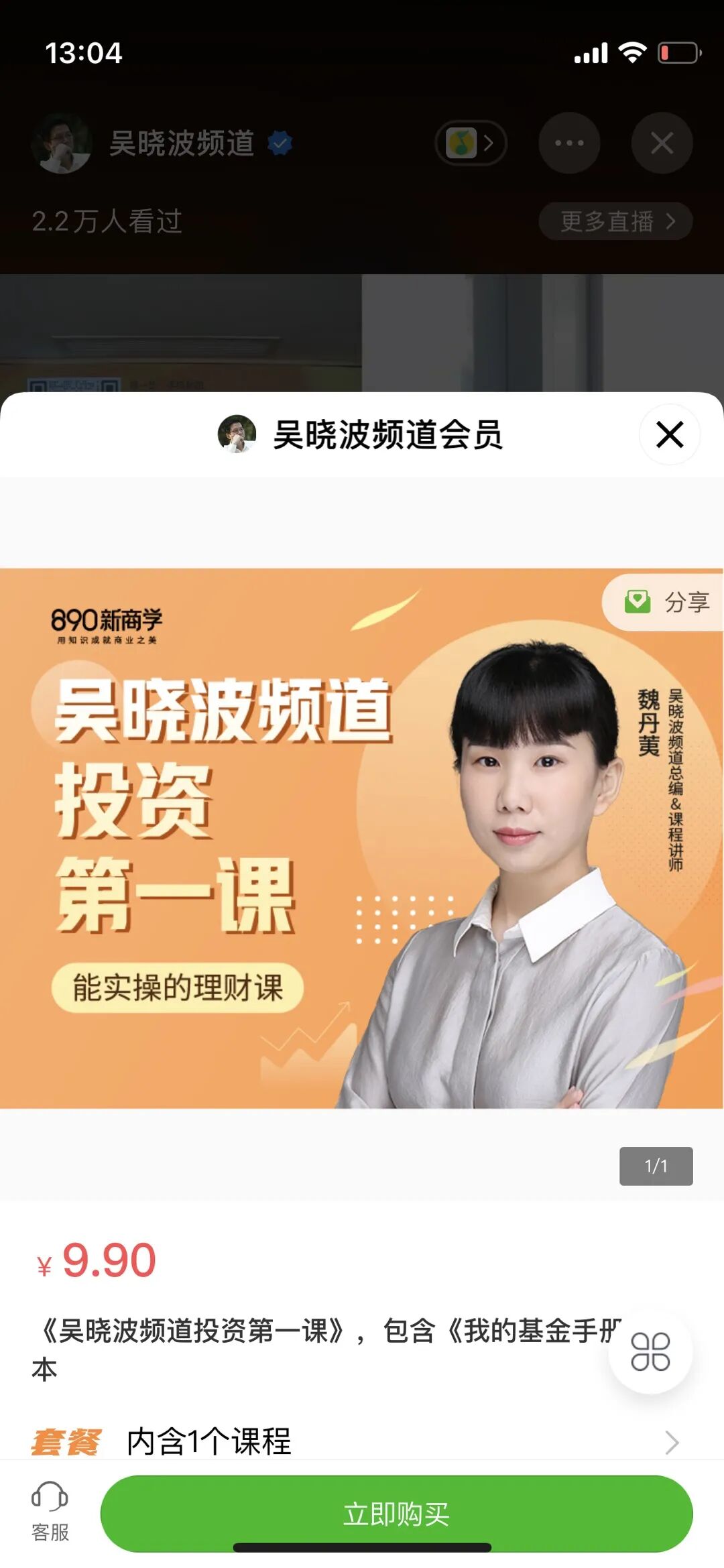 吴晓波频道的总编魏丹荑,亲自下场坐阵直播间,她的身后是9.9元低价体验课的卖点提示牌。