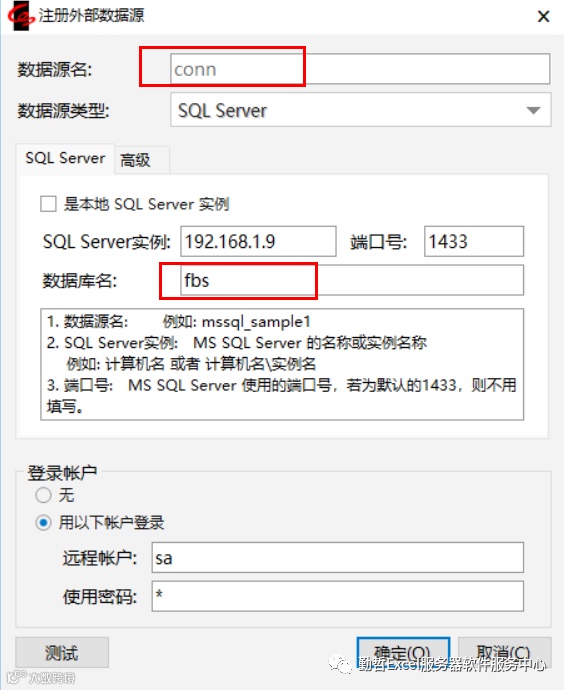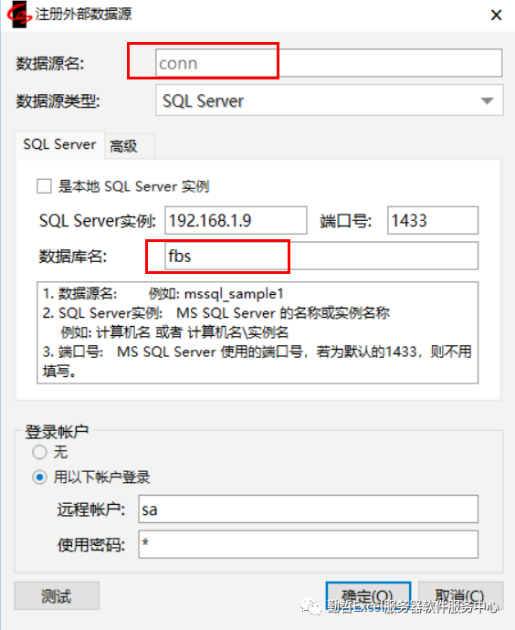 第一步:注册外部数据源,数据源名可自定义,数据库名输入你要连接的数据库,如下图。