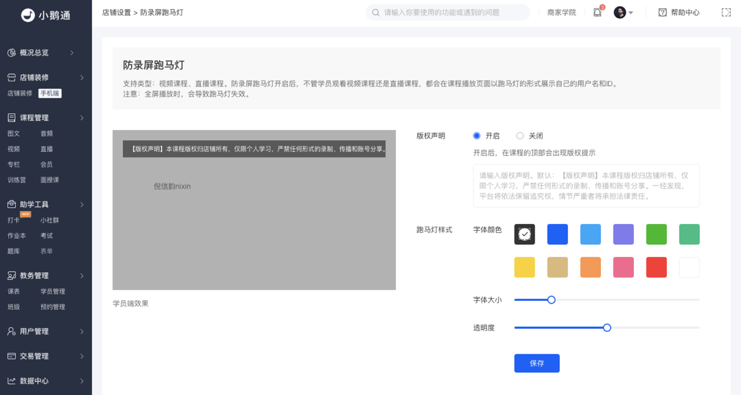 为了守护广大商家的内容安全,我们推出了防录屏跑马灯功能,用全新的产品和技术手段,为数以千万的知识成果保驾护航。