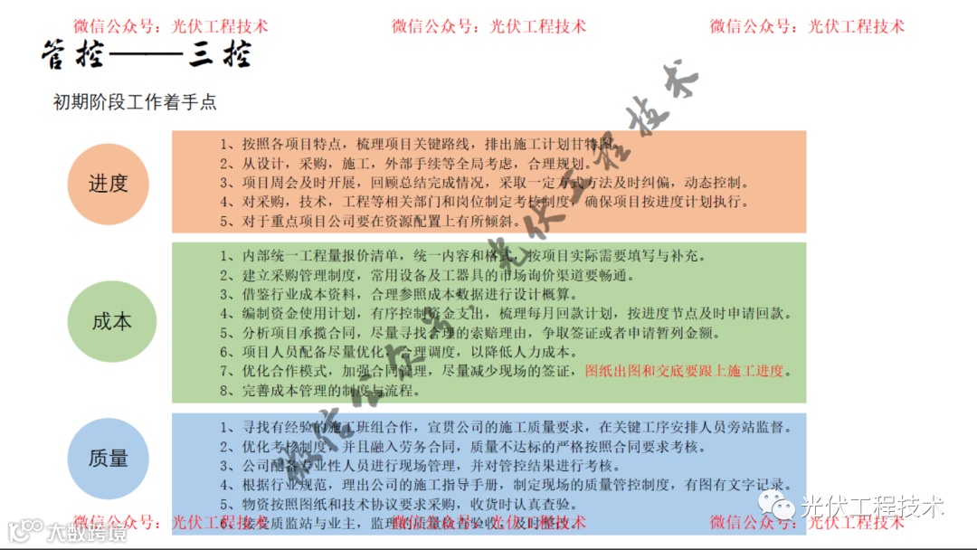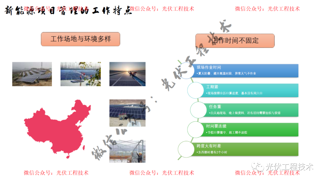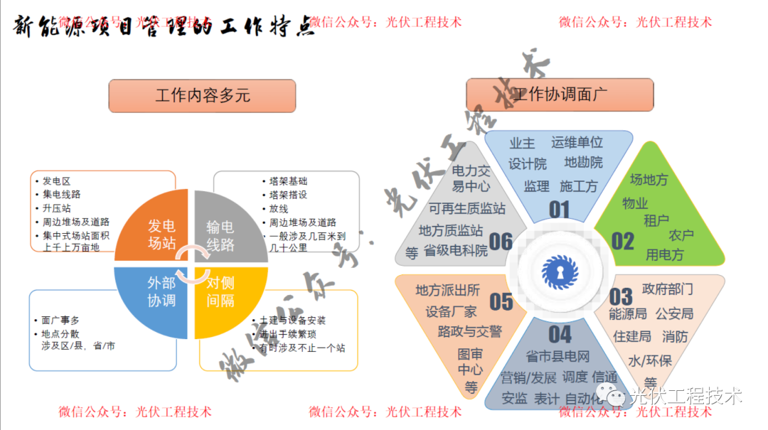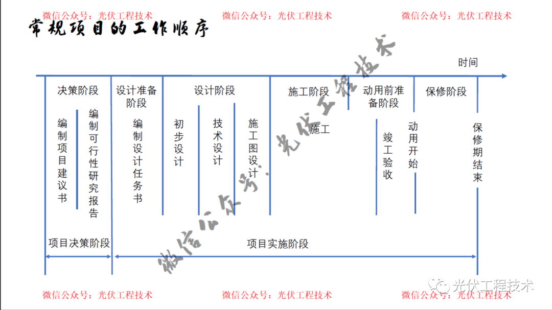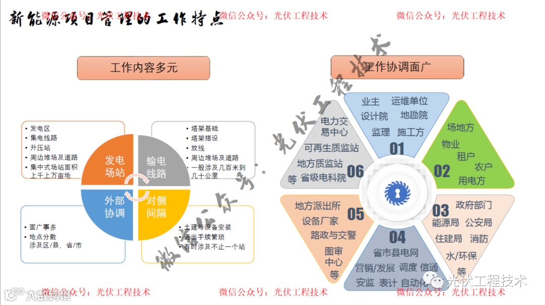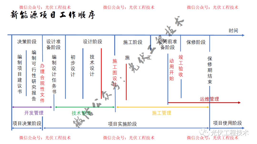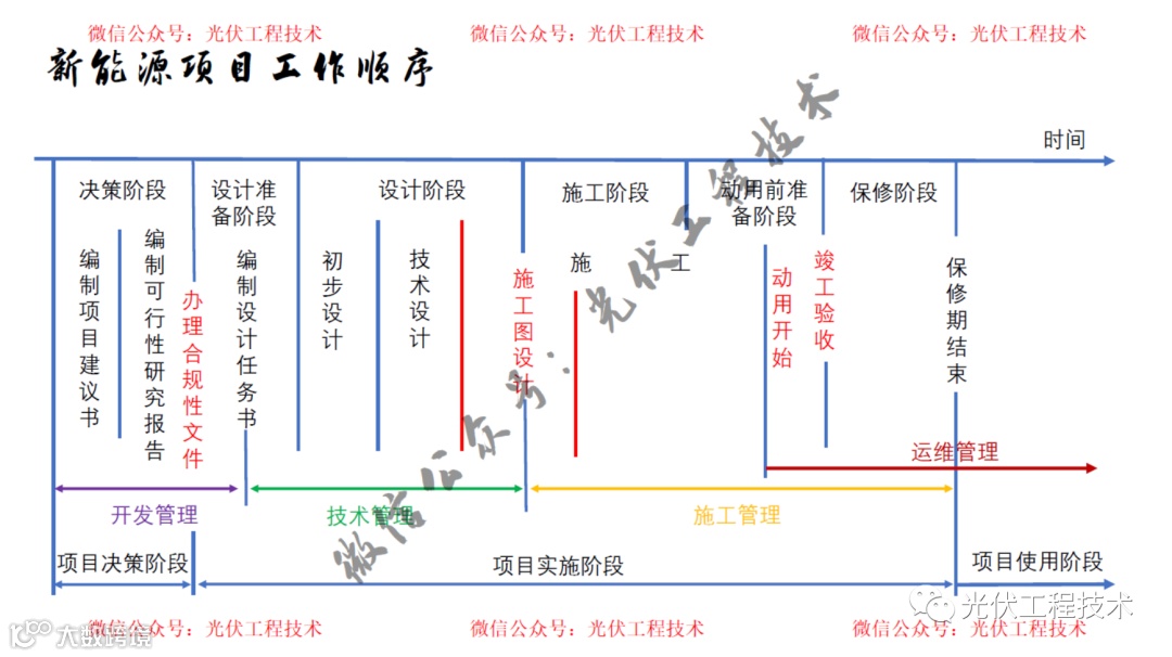 新能源工程在实施的时候一般都是时间紧,任务重,有些是边画图边施工。在开发与技术,技术与工程,开发与工程之间一般都是有交叉实施的事项存在。新能源工程不同于其他常规工程的最大特点我认为就是先投运后竣工验收(这里指的是投资方业主的竣工验收),在项目具备投运条件的时候,由相关部门验收检查,在确认没有问题的情况下会被允许投运,然后才是投资方业主的竣工验收。