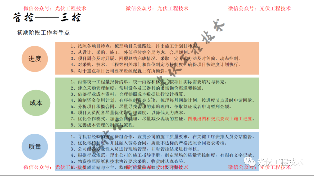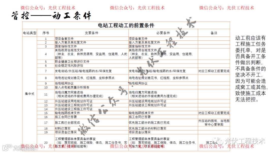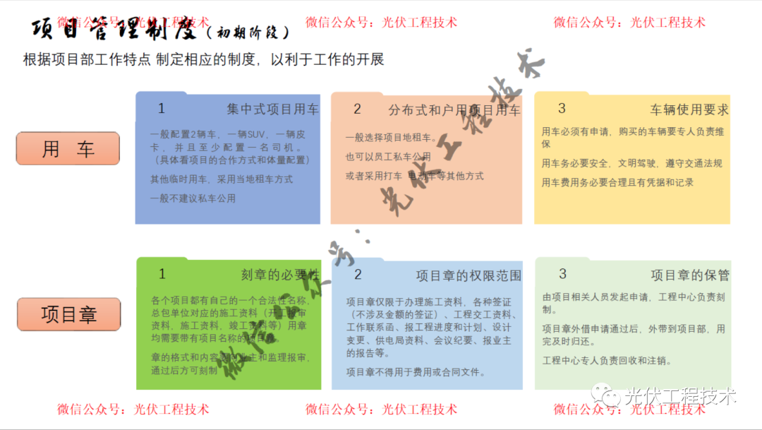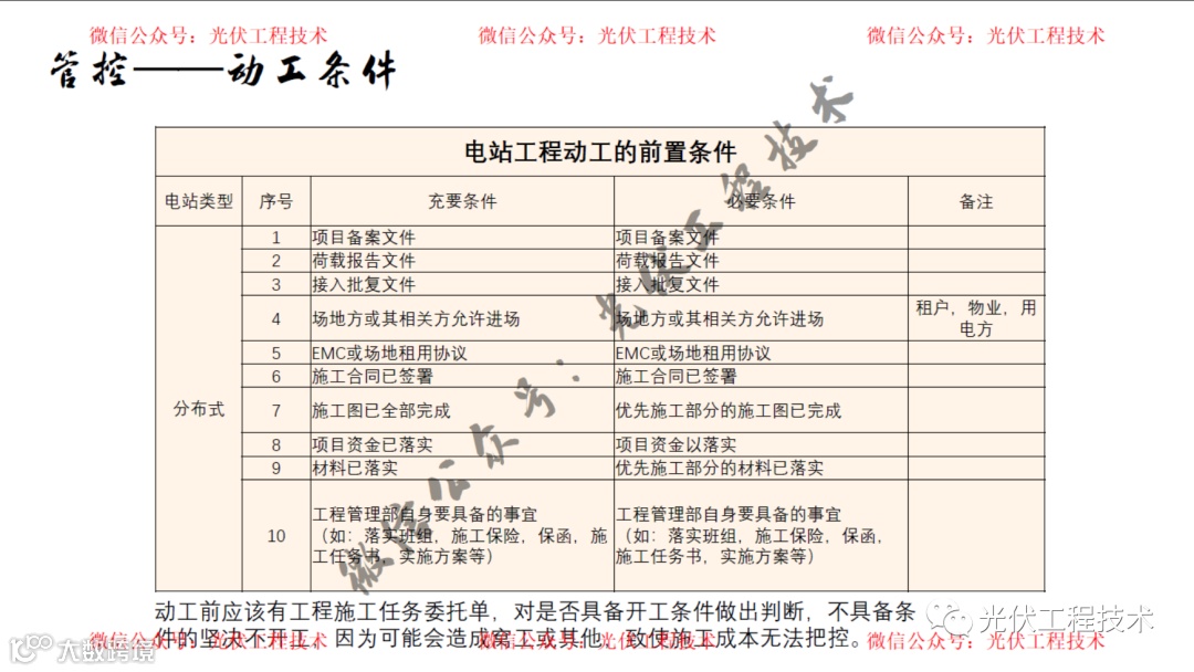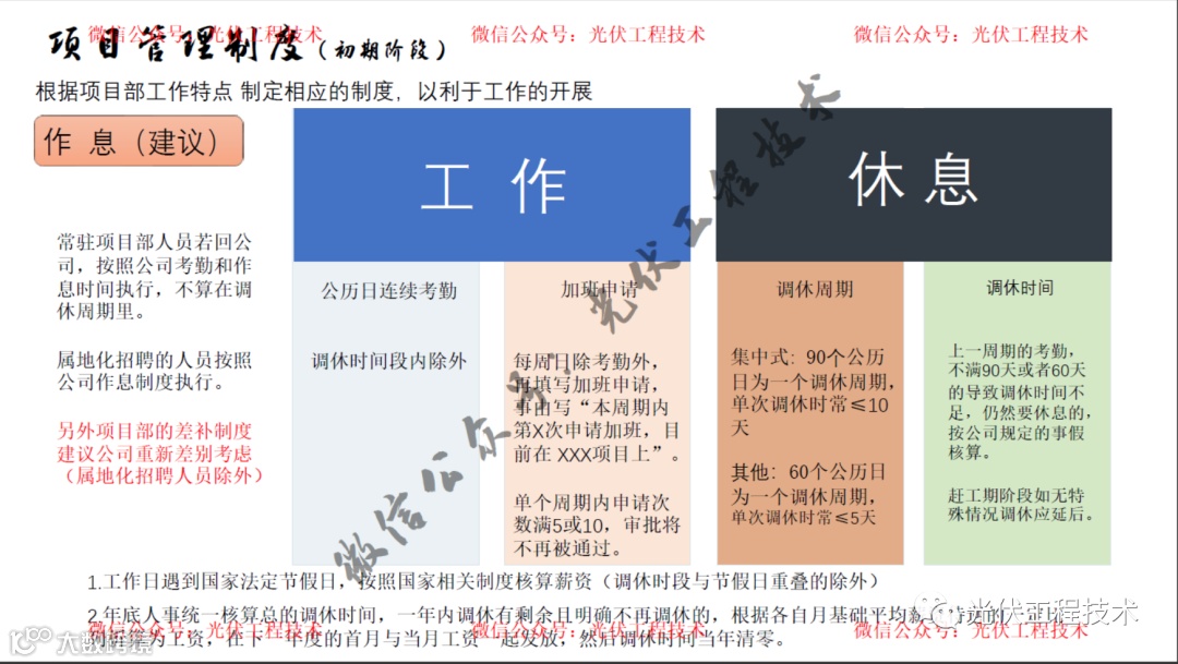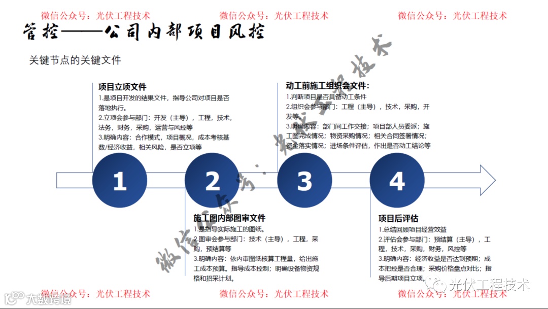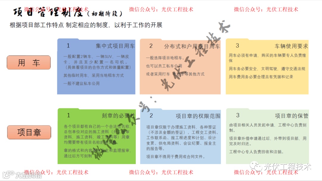 新能源工程在实施的时候一般都是时间紧,任务重,有些是边画图边施工。在开发与技术,技术与工程,开发与工程之间一般都是有交叉实施的事项存在。新能源工程不同于其他常规工程的最大特点我认为就是先投运后竣工验收(这里指的是投资方业主的竣工验收),在项目具备投运条件的时候,由相关部门验收检查,在确认没有问题的情况下会被允许投运,然后才是投资方业主的竣工验收。
