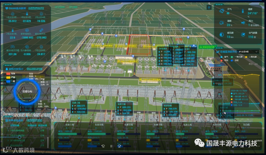 各场站全局信息可视化:对光伏场站的环境参数、发电量统计及计划、今日报警/未读报警、接入逆变器数量/逆变器总容量等信息进行监控展示。