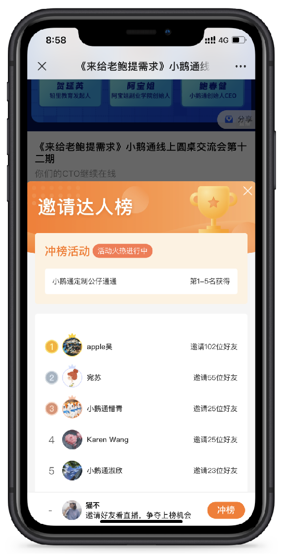 邀请达人榜前5名,分别赠送小鹅通定制公仔通通1只