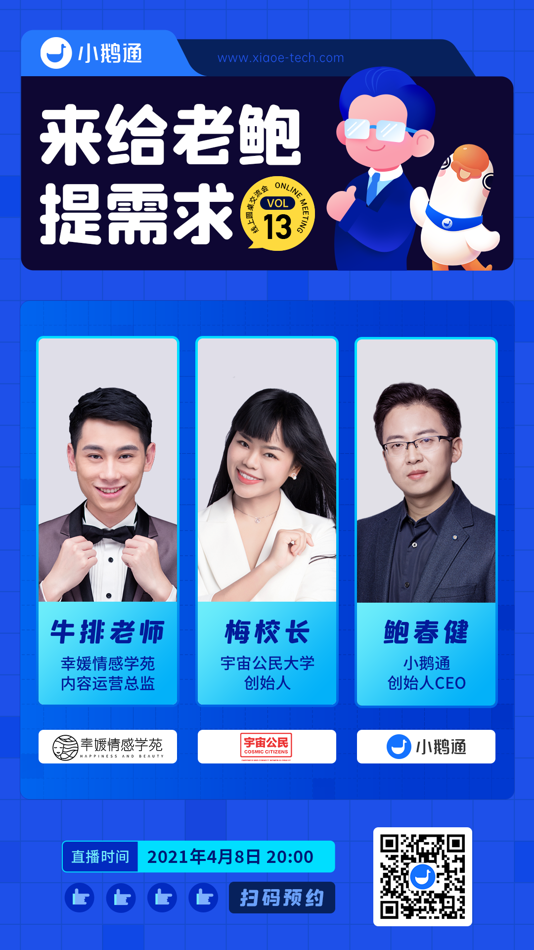 4月8日下周四晚20:00,《来给老鲍提需求》第十三期,老鲍和你继续相约!