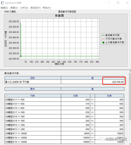 可以看出在满足所有约束条件下,预测变量“总成本”的最小值接近225300元。