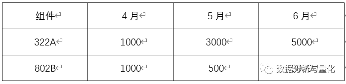 某轴承公司生产两种不同的电子组件,即322A和802B,公司在接下来的3个月里都会通知该公司的销售人员每个星期的需求量,下图是刚刚接到的未来3个月的订单: