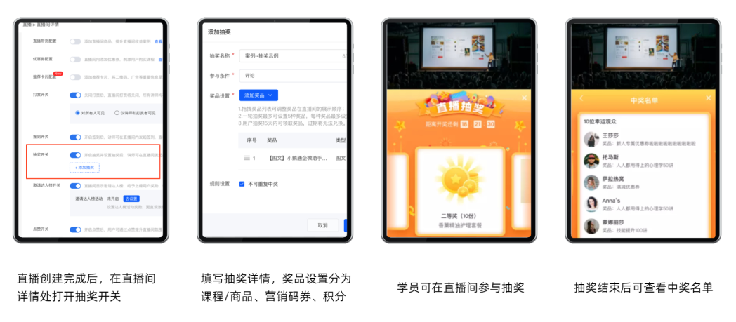 通过微信公众号推文、社群通知、朋友圈等方式,提前告知直播和抽奖信息。待学员进入直播间后,通过口播、直播间公告、悬浮图贴片公告等形式说明抽奖规则和参与方式。到了抽奖时间,直播讲师或助教提醒学员抽奖马上开始,带动学员在评论区刷指定的评论或弹幕,活跃直播间气氛。