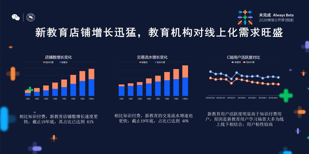 在演讲的最后,樊晓星还以家长大学和上海环球教育举例,分析了未来趋势:第一,相比知识付费,新教育的店铺数量以及新教育机构接受线上化的进程更加的迅速;第二,相比于知识付费新教育的店铺在线上营收比例增加的也更快;第三,新教育用户活跃度明显高于知识付费的用户。