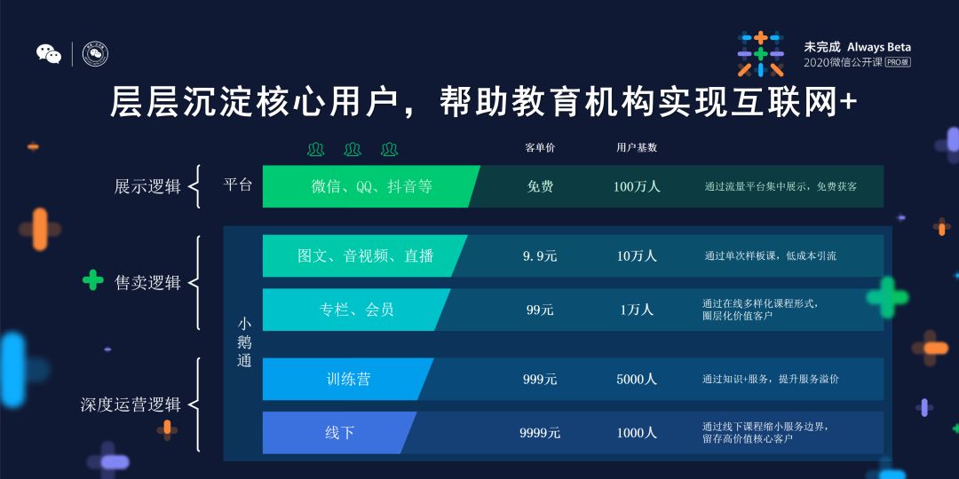 从微信、QQ、抖音等平台上,触达大量用户成为一件容易的事情,但如何让用户找到我们呢?樊晓星回答道,通过小鹅通,即可在微信等平台上搭建一站式网校,以图文音视频、专栏会员等售卖逻辑,就可以不断地达到层层筛选核心客户的目的,进一步提高核心客单价,最后持续去运营这批核心客户。