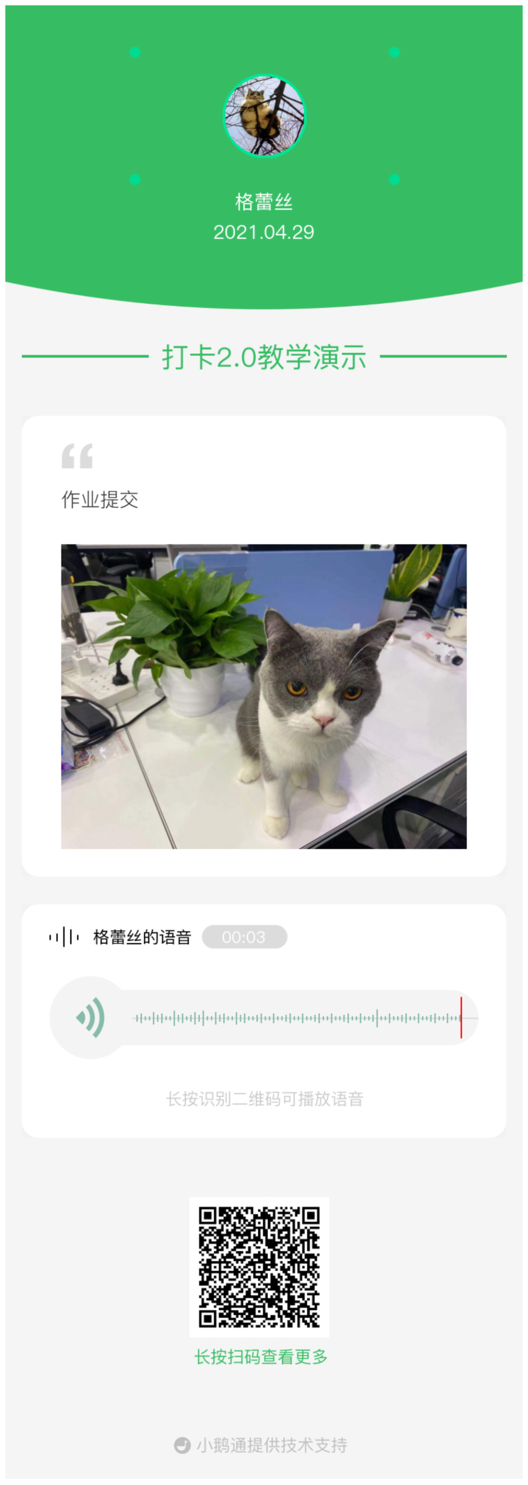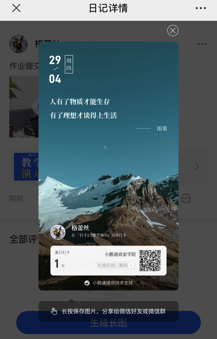 打卡日记、长图可完整展示学员的打卡内容,展示图文,音视频等打卡素材并附带课程二维码。