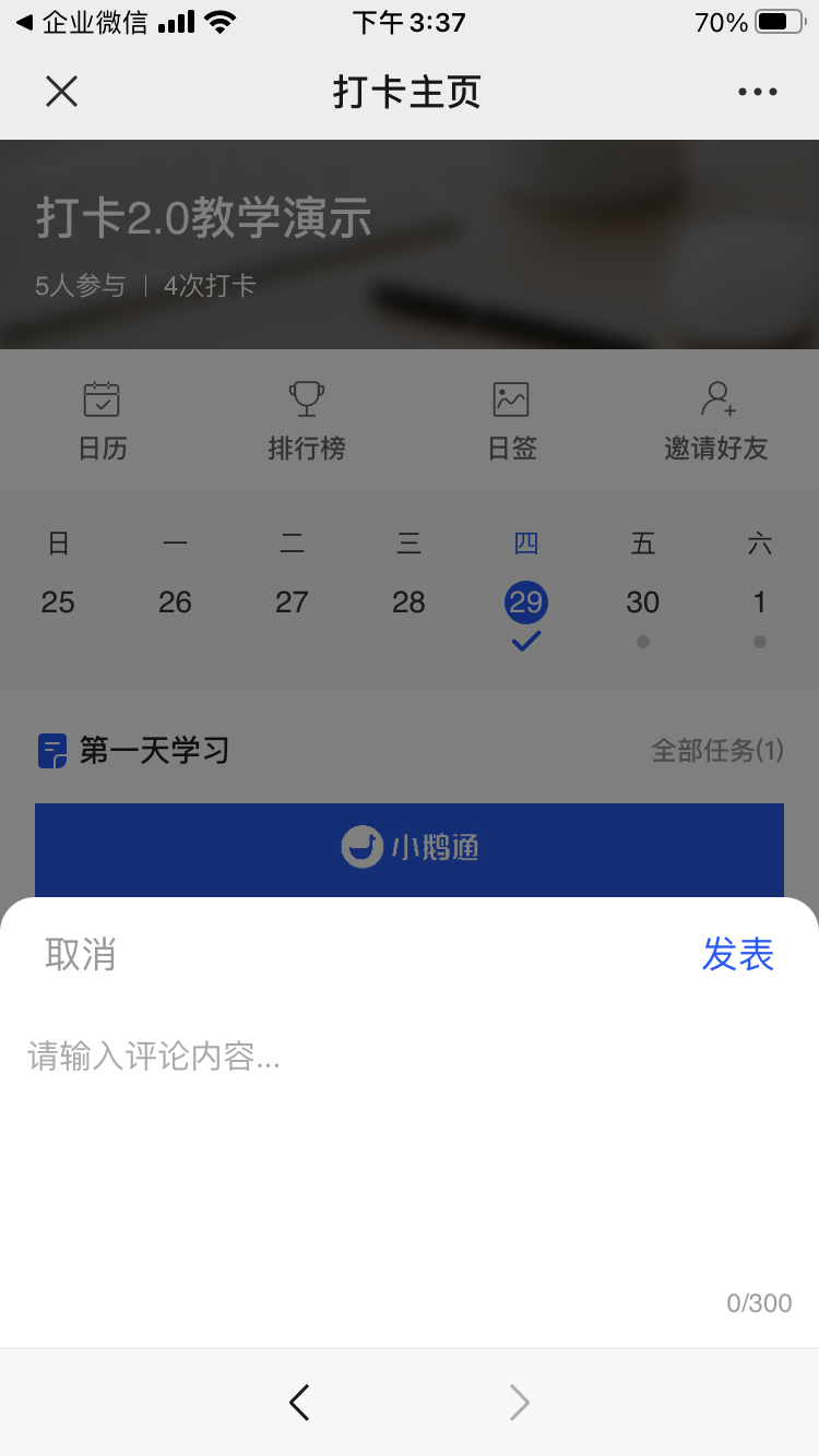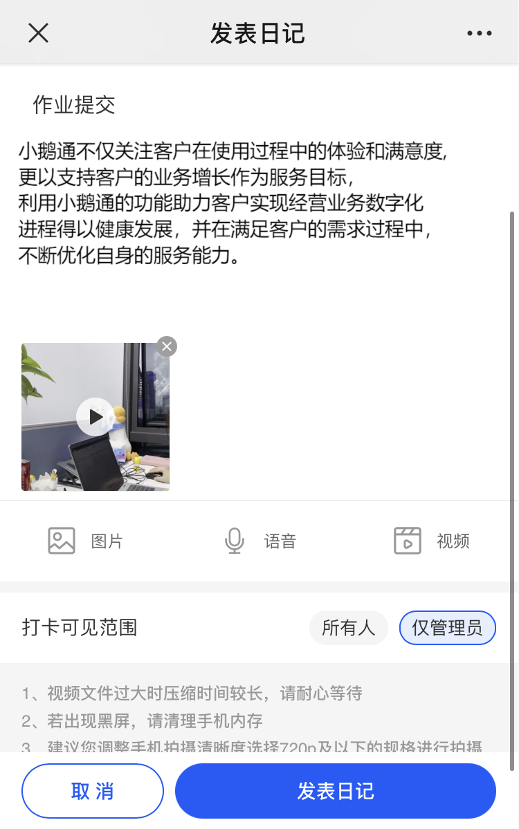 目前,小鹅通打卡已全面支持学员提交多媒体打卡作业内容,除了图片和文字外,学员也可以上传音视频打卡作业。