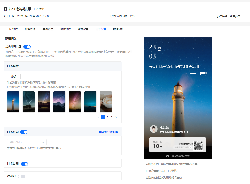 打卡日签可自定义日签照片,金句库和展示行动力,可配置课程相关的金句库。学员完成打卡后自动弹出日签,可保存至手机相册并进一步转发。通过日签自带二维码,也可以增加课程曝光,驱动课程自增长。