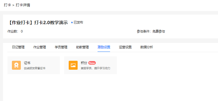 【作业打卡】适合作业密度比较低,提交频率不固定,或开班时间不明确的课程。可根据课程内容和节奏按需布置作业,灵活度较高。也可设定补交规则,促进学员听课。