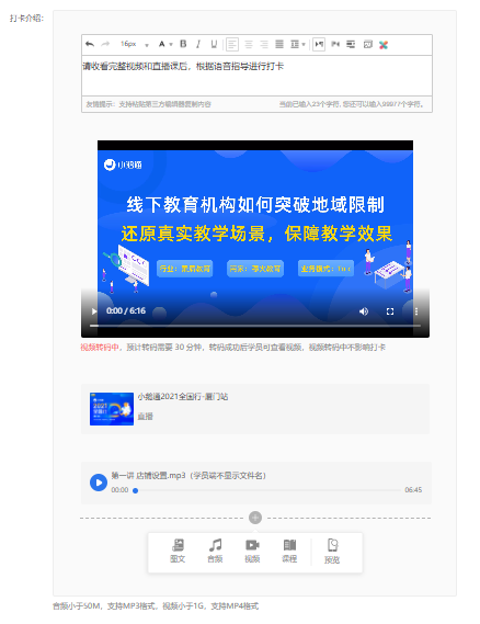 也可插入图文、音视频,直接引导学员在打卡页面收听学习内容后,根据引导提交作业。