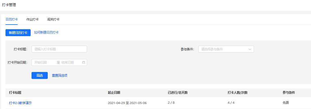 【日历打卡】适合学习周期固定,需要以固定节奏每天或隔天进行学习和记录反馈的课程,如7天训练营,21天训练营等。