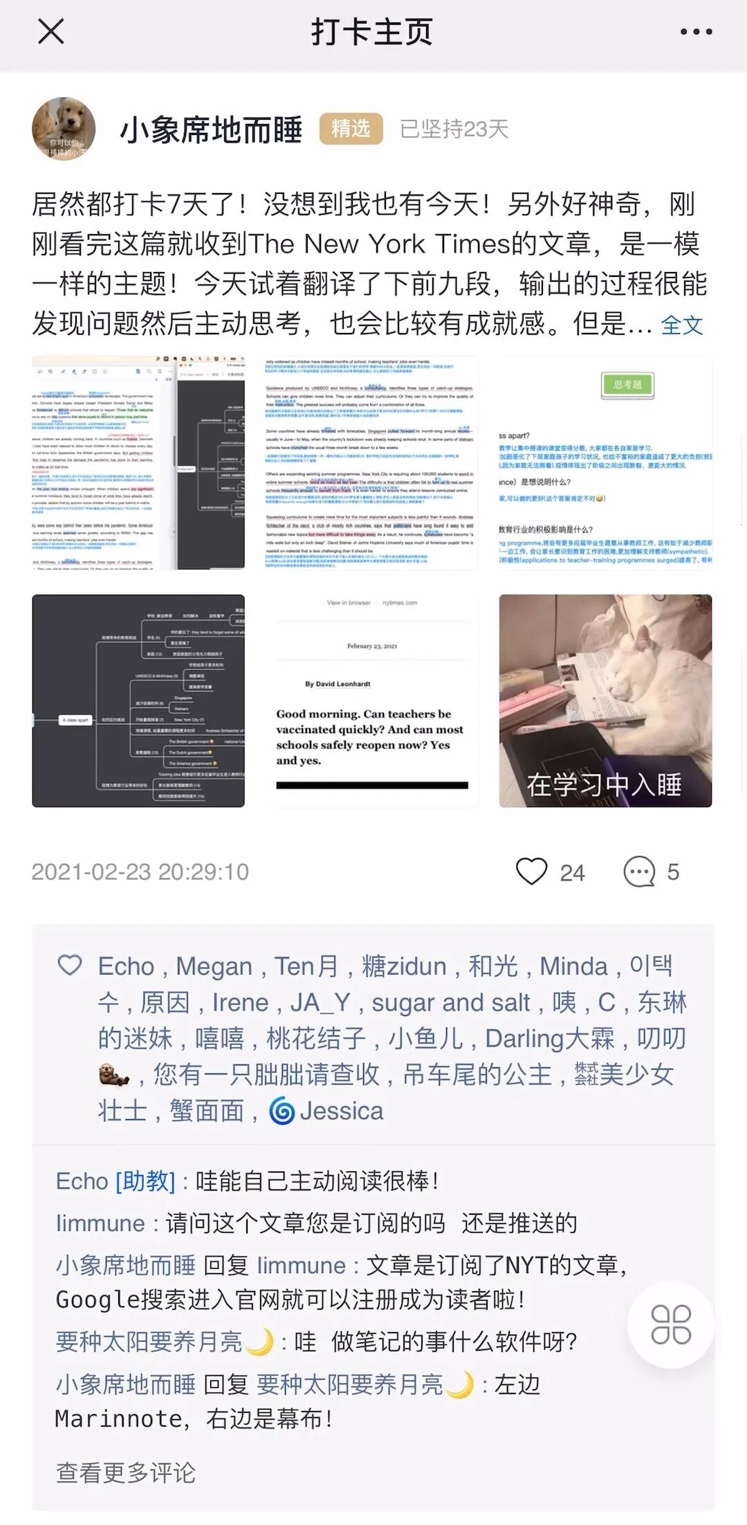 新版打卡工具优化了学员互评路径,点击评论他人的打卡内容后,会直接在原界面弹出评论输入框,交互体验更优。
