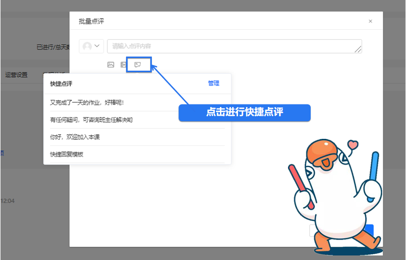 升级后,新版打卡功能支持快捷回复和批量点评,可在管理台配置常用内容模板,批量选中后对学员进行统一回复。