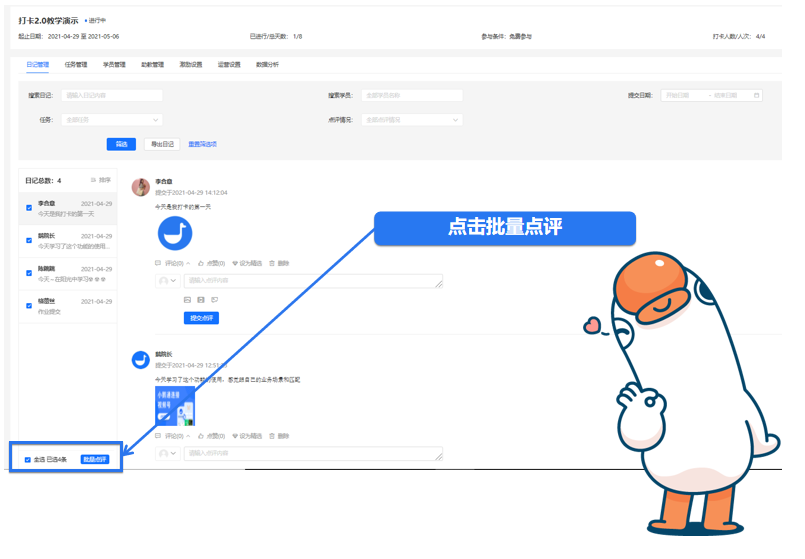 打卡→打卡详情→日记管理→选中学员列表→进行批量点评
