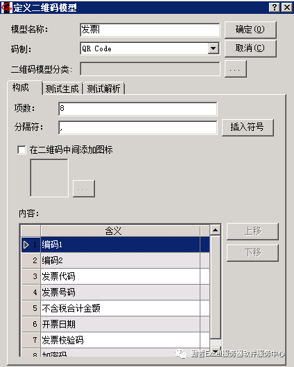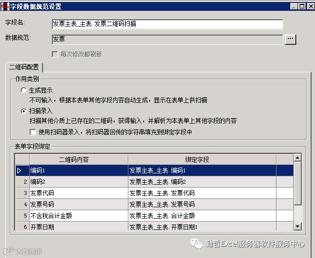 其中:发票二维码扫描字段的数据规范关联刚才定义好的二维码数据类型。