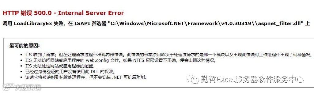 现象:登录esweb报HTTP 错误 500.0 - Internal Server Error 调用 LoadLibraryEx 失败,在 ISAPI 筛选器 C:\Windows\Microsoft.NET\Framework\v4.0.30319\\aspnet_filter.dll上。如下图: