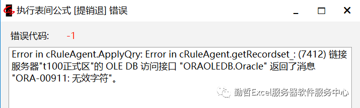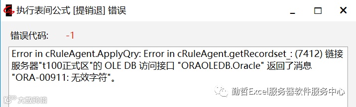 问题:执行提数公式的时候,报Error in cRuleAgent.ApplyQry:Error in cRuleAgent.getRecordset:(7412)链接服务器"t100正式区"的OLE DB访问接口"ORAOLEDB.Oracle"返回了消息"ORA-00911:无效字符"。如下图: