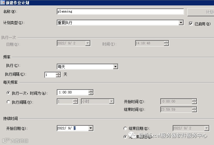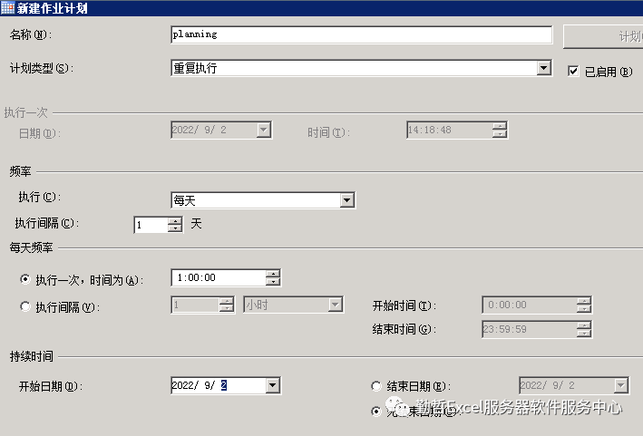 7、配置作业计划具体内容,输入计划名称;执行频率为每天1点,持续时间为无结束日期(实际可自定义更改),完成后点击“确定”按钮。