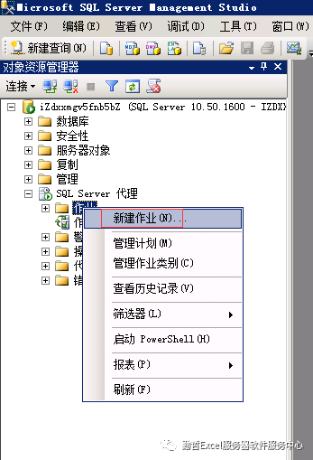 1、通过SSMS进入数据库后台,找到【SQL Server代理】——【作业】(鼠标右键)——【新建作业】,如下图: