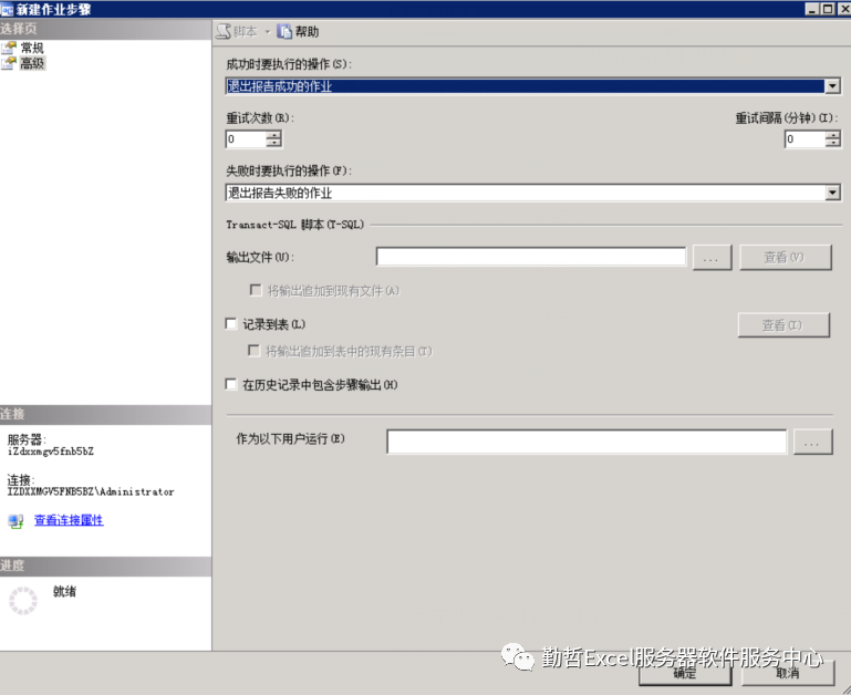 5、选择左侧菜单【高级】选项,如果只有一个步骤,在成功时要执行的操作中,选择“退出报告成功的作业” ,点击“确定”按钮结束作业步骤,回到主菜单。