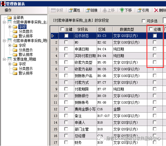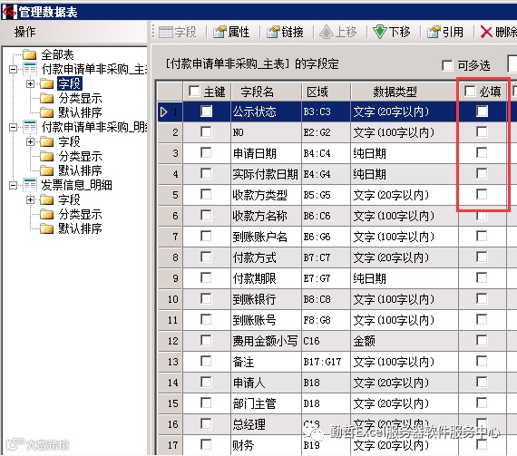 实现:在主表里面加一个辅助字段来实现,勾选必填,并给出必填提示。