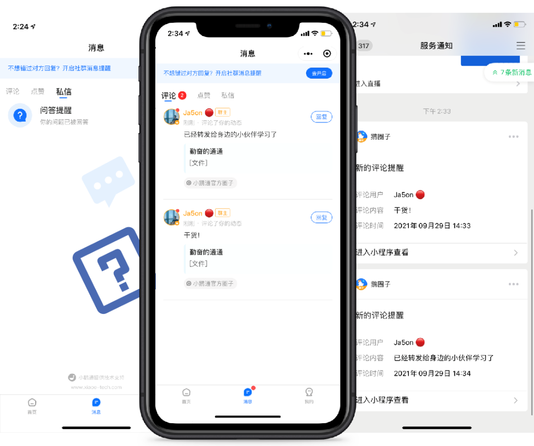 用户发表的帖子收到评论、点赞或者提问收到回复,都在「鹅圈子」的消息板块收到提醒,发表有反馈,用户互动动力更足!