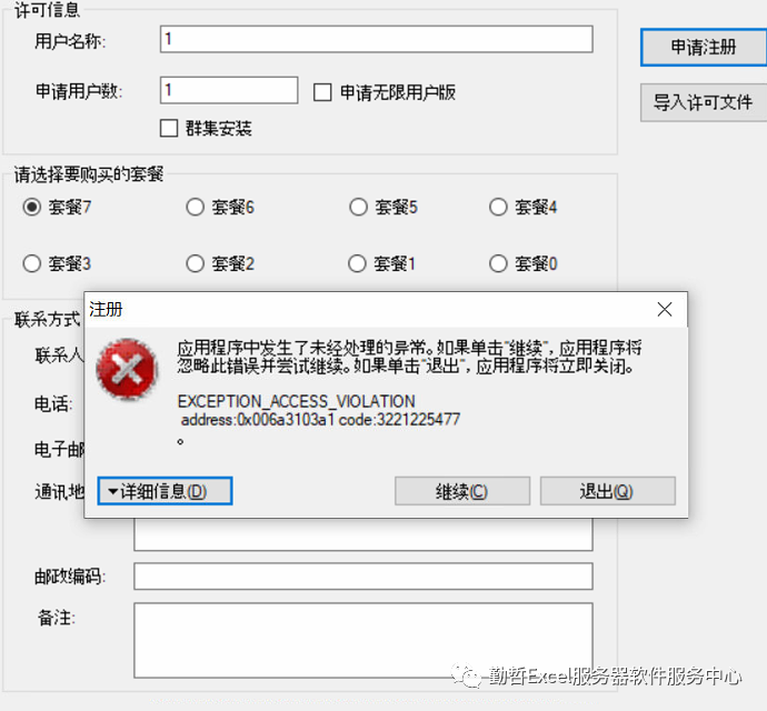 现象:在登录勤哲Excel服务器软件的系统管理台后,当点击“申请注册”按钮将申请注册信息以txt的形式保存到本地的时候,报如下错误:应用程序中发生了未经处理的异常。如果单击“继续”,应用程序将忽略错误并尝试继续。如果单击“退出”,应用程序将立即关闭。