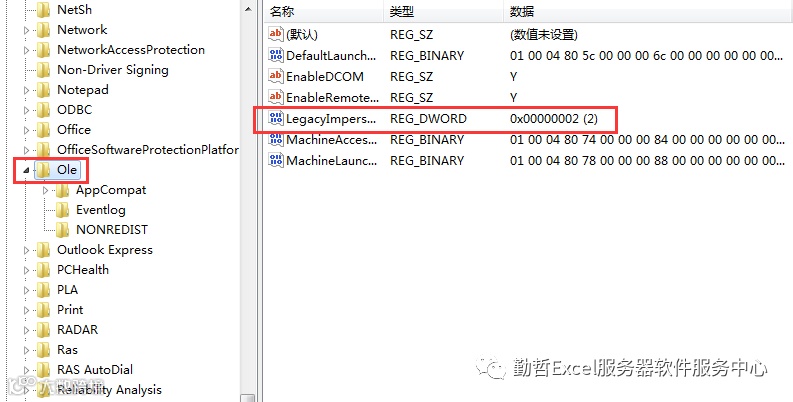 HKEY_LOCAL_MACHINE\SOFTWARE\Microsoft\Ole目录下的LegacyImpersonationLevel,将其数值修改为3。