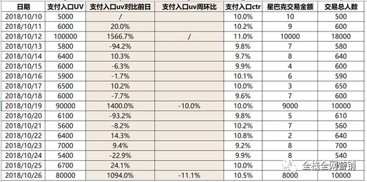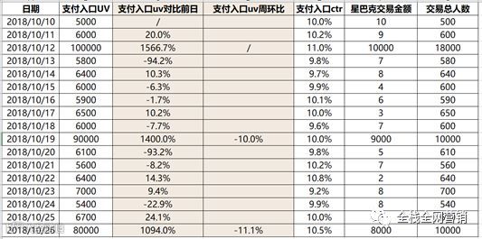 支付入口UV在星巴克活动的时候涨的很厉害,但是支付入口的ctr基本稳定在10%上下,最低9.2%,最高10.5%,幅度在-0.8%~+0.5%,甚至做活动的时候还出现比平时更低的情况。