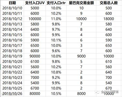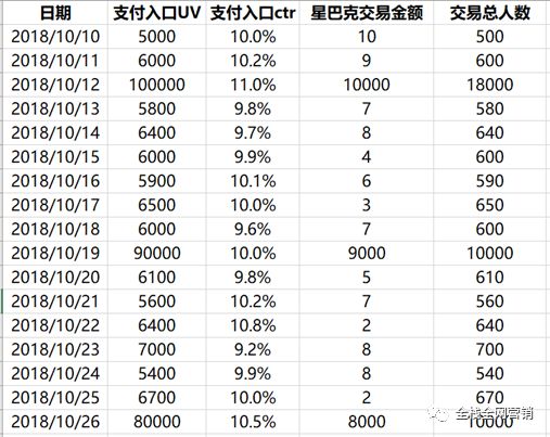 通过交叉分析,得到了第4条事实:支付入口UV和支付入口ctr交叉分析后发现,ctr几乎没有变化,暴涨的流量难道都是来消费星巴克的吗?UV和ctr是否真的如数据所示毫无关系吗?