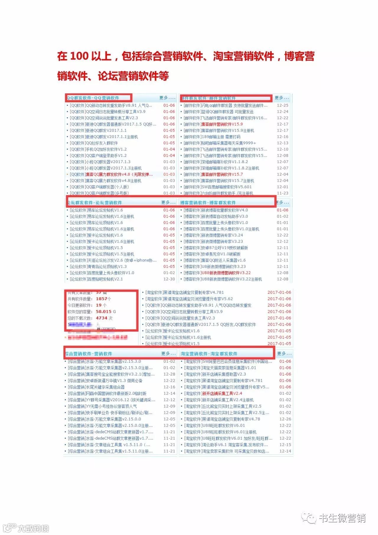最后,我还会提供一个软件资料库,这是一个会随时更新的软件网站,在网站上面目前已经有将近2500款必备的营销软件,这些软件是批量的必备工具,包括博客软件、QQ软件、论坛软件等等;