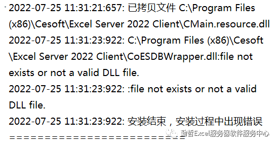 问题:我在某台机器上安装Excel服务器客户端程序的时候,遇到了如下错误:file not exists or not a valid DLL file,导致安装失败。