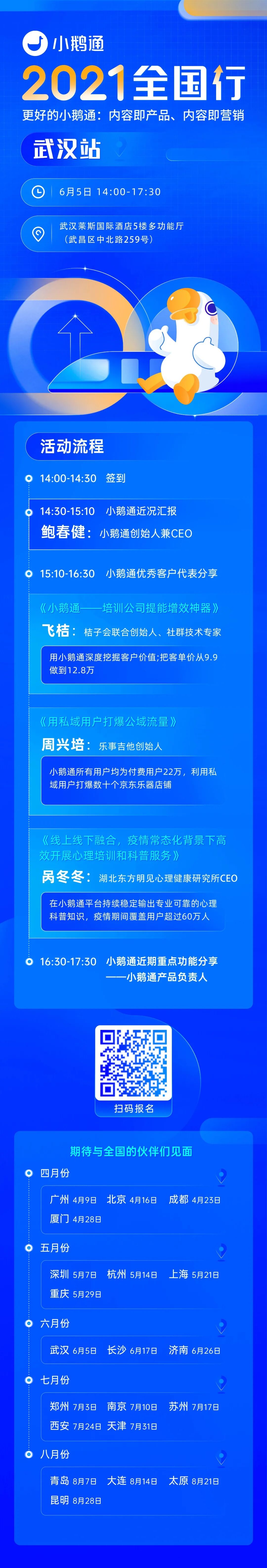 干货满满的内容分享,思维碰撞,拓展同业人脉,优质资源置换一切尽在小鹅通2021全国行武汉站(6月5日周六),我们在武汉莱斯国际酒店5楼多功能厅(武昌区中北路259号)等你!