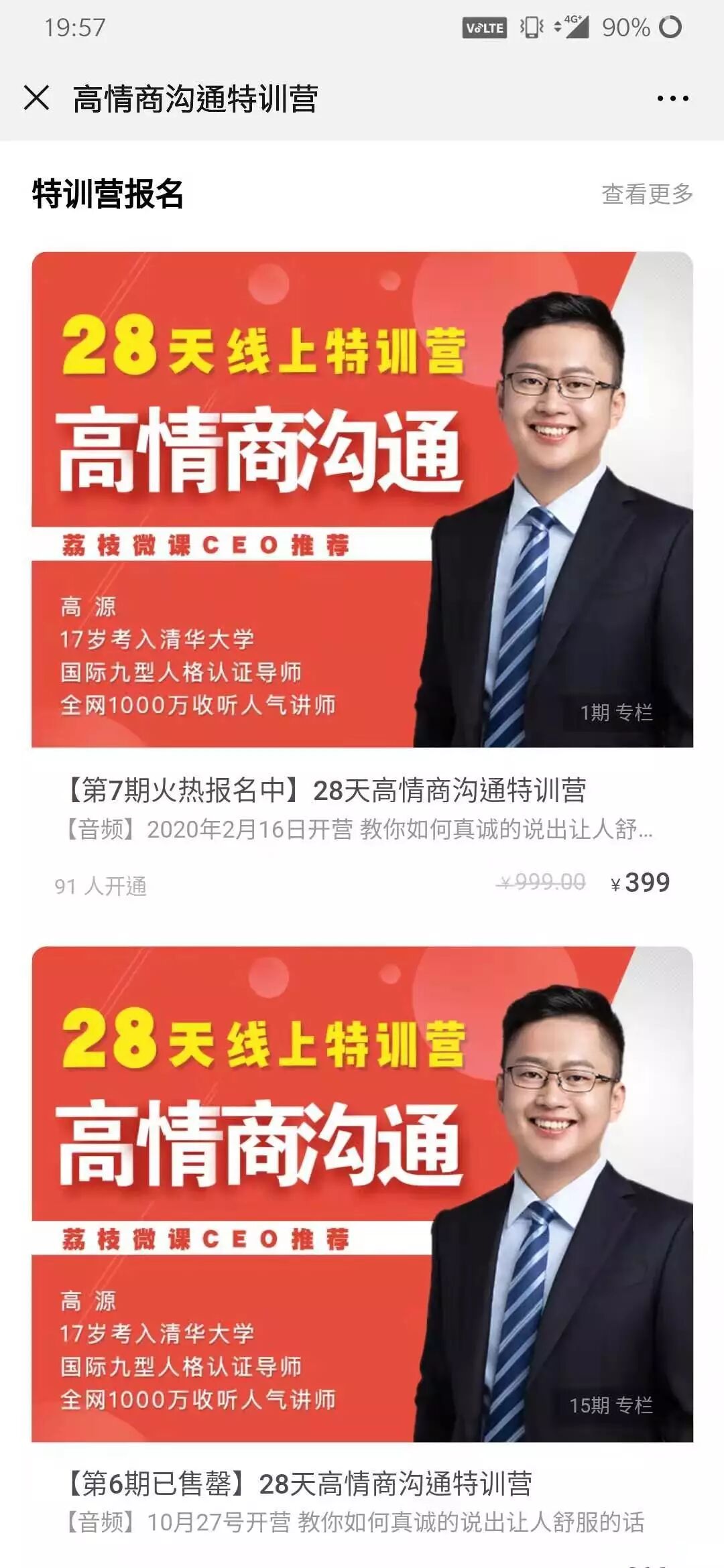 这一改变成功地将他们线上模式拉回正确轨道。他们试水线上训练营第一门课程是《28天高情商沟通特训营》。