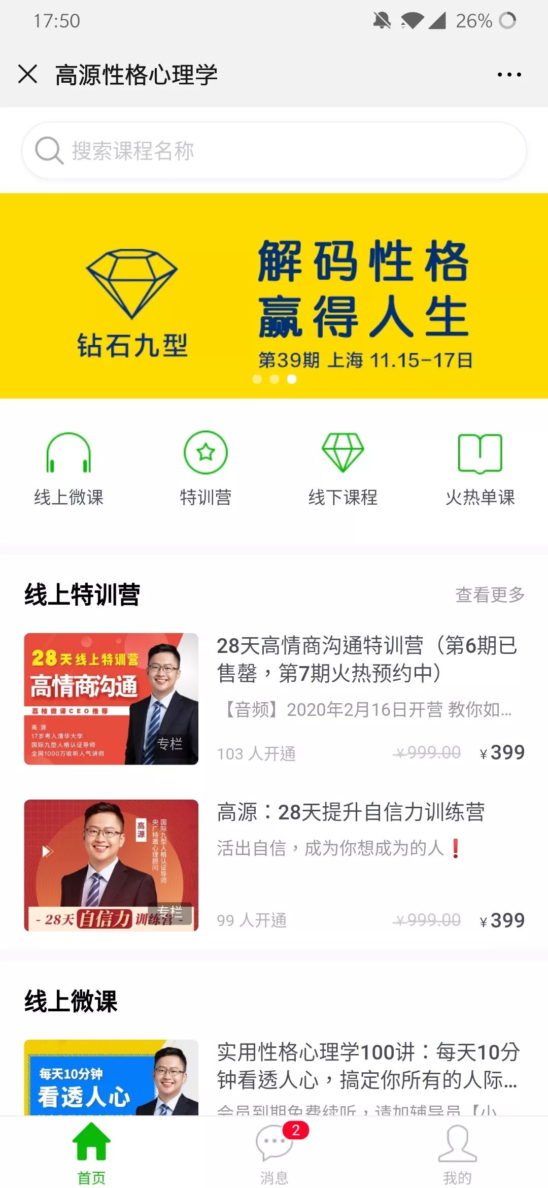 截至目前,「 高源性格心理学」小鹅通店铺上已经包含了线上微课、特训营、线下面授课、公益访谈等上百门课程。