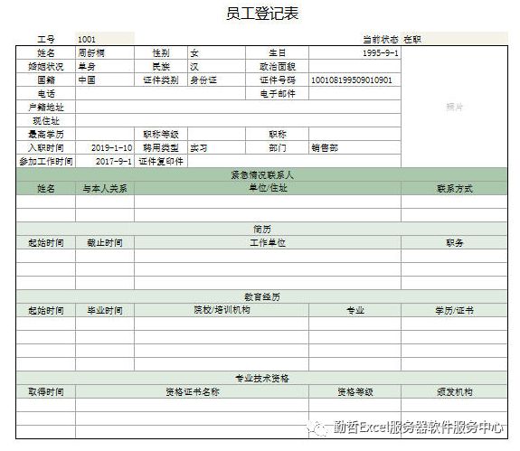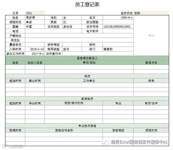 员工档案:包括员工基本信息维护,以及劳动合同维护。员工信息存储于如下的员工登记表。
