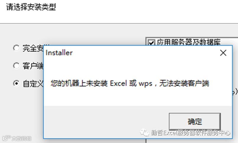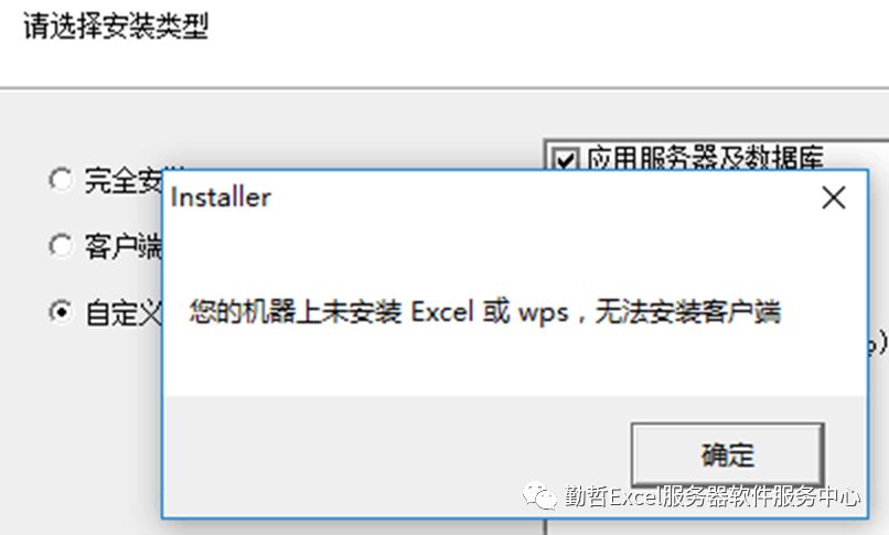 场景:在勤哲Excel服务器软件的安装过程中,客户有时候会遇到这样的提示:您的机器上未安装Excel或wps,无法安装客户端,如下图。