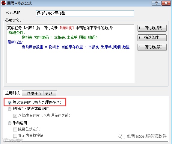 其中:记得勾选含修改保存前(含办理保存之前),原理就是修改的时候,首先会执行这条公式,也就是复位库存,然后再执行每次保存时(每次办理保存时)的回写修改公式。