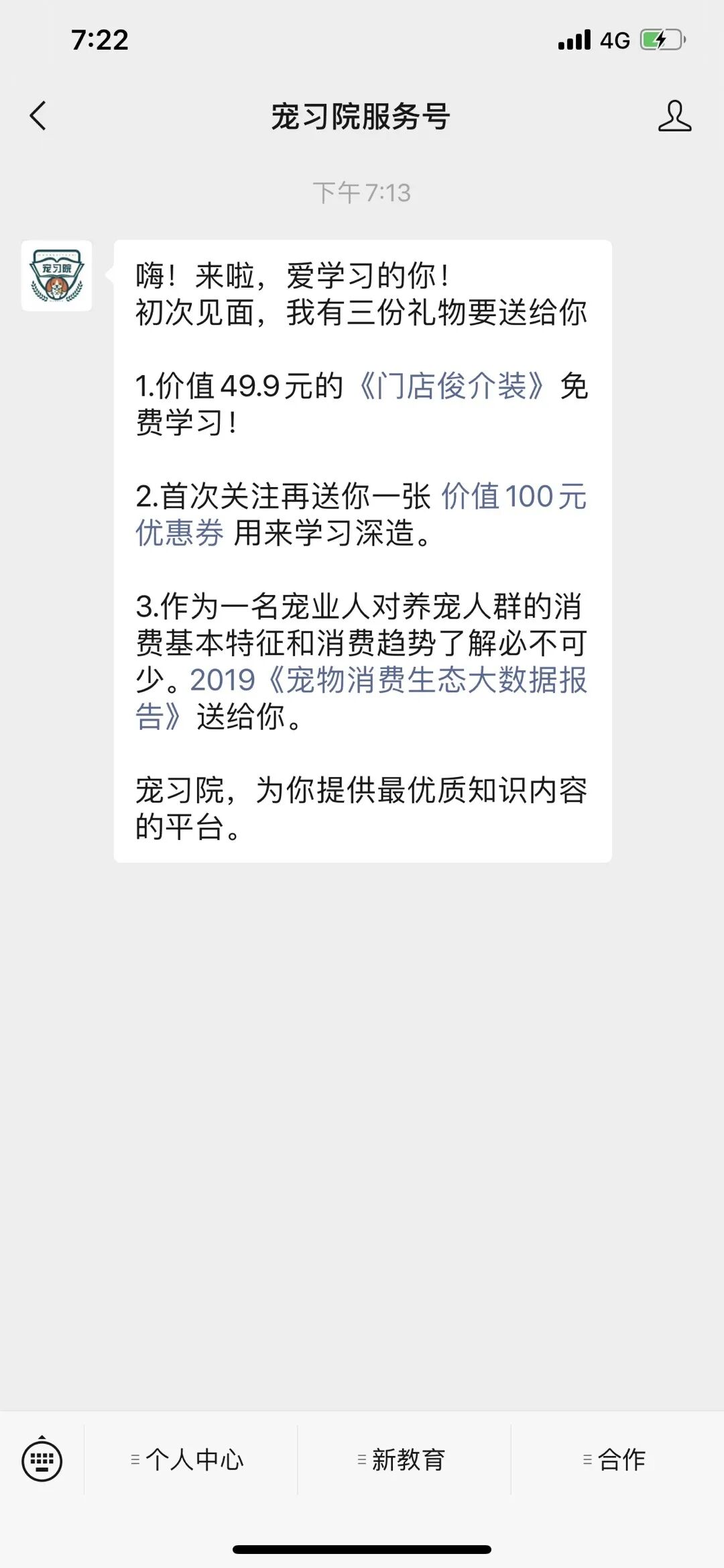 「宠习院」更是将公众号自动回复设置用到极致,分别为新关注的学员提供三种惊喜:视频课程、优惠券、行业资料,大大提高了新关注学员的好感,让他们知道「宠习院」定位作用以及其小鹅通店铺。