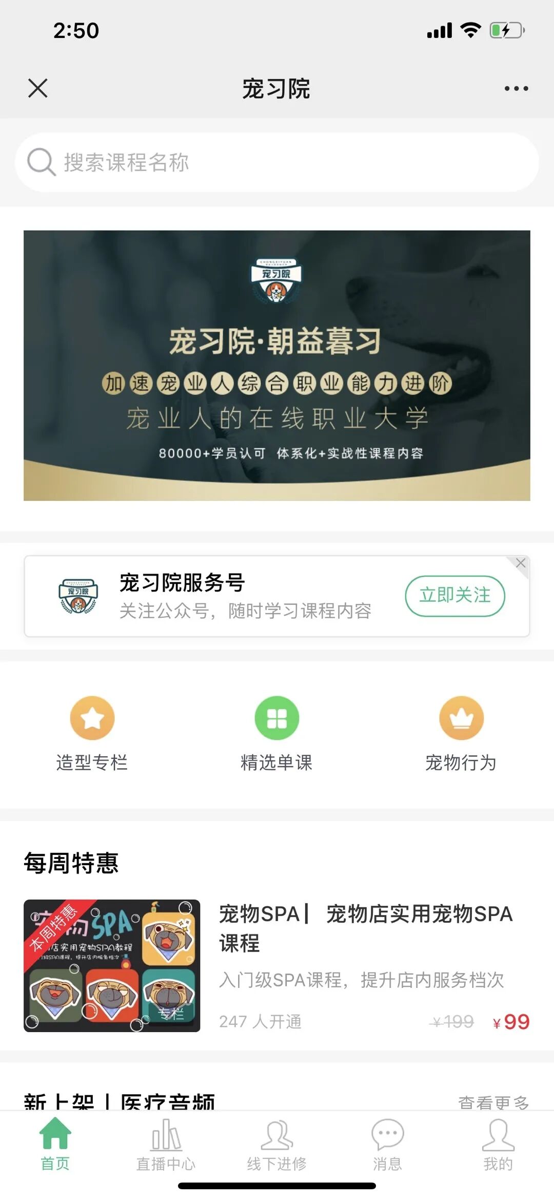 「宠习院」则将皇牌课程《门点俊介装》作为关注福利,学员点击后进入小鹅通店铺进行学习,在体验过程中学员也可以看到「宠习院」完整的课程体系,为品牌认知打下牢固的基础。