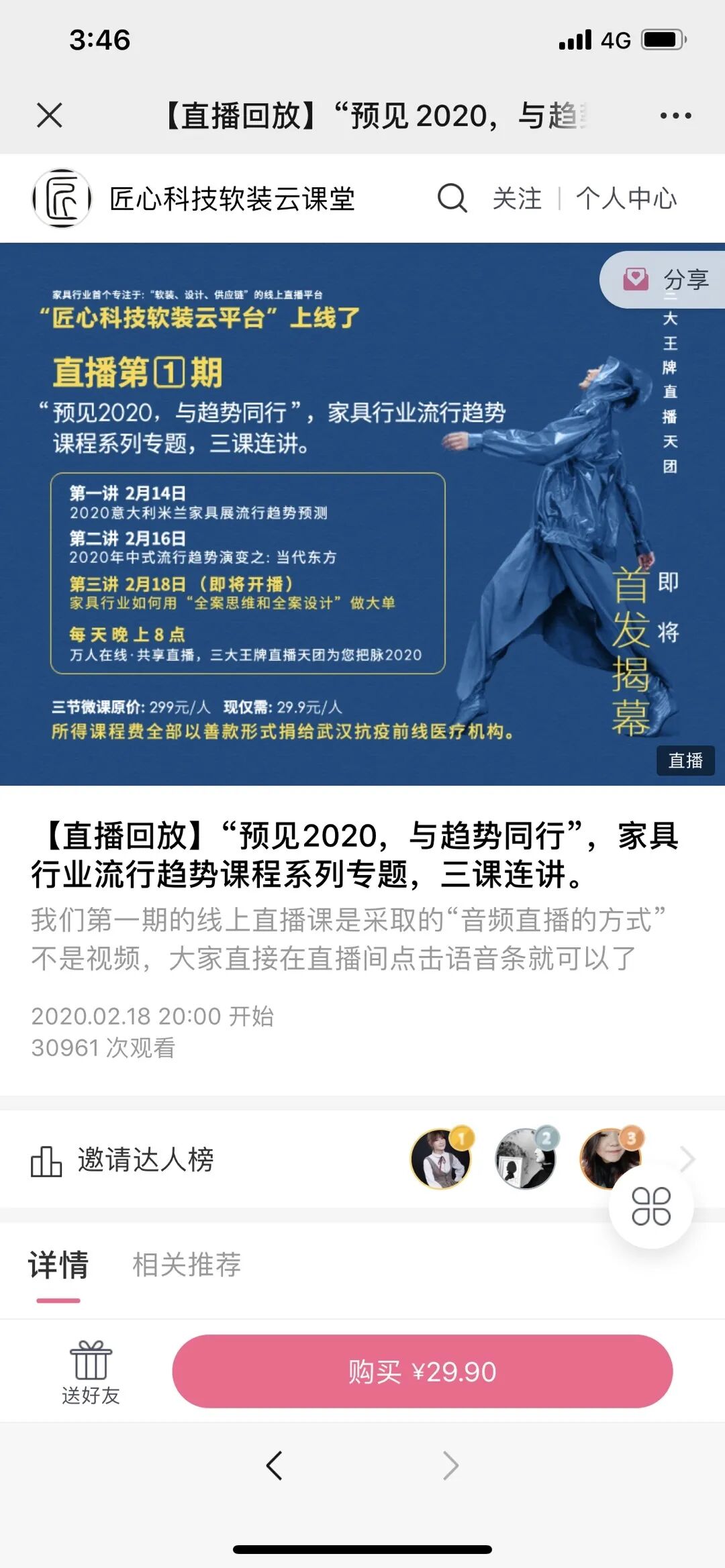 他们在春节期间,通过小鹅通公开课直播,推出《预见2020,与趋势同行”,家具行业流行趋势课程系列专题》,邀请了3位行业大咖各自分享他们对于家居行业未来流行趋势的预测。一场直播三课连讲,累计吸引了30,000+人次观看,成为行业的一大爆款。