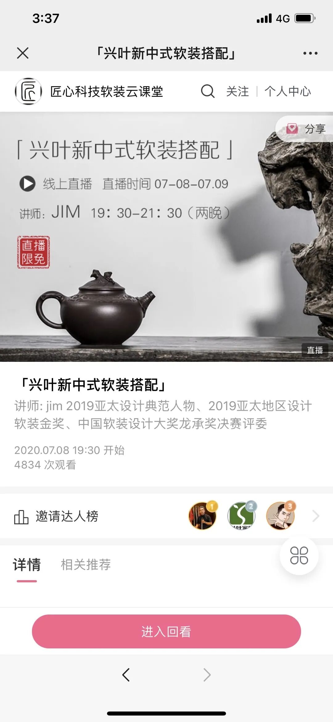 在《兴叶新中式软装搭配》直播课程里面,匠心科技邀请了著名设计大咖来到直播间进行为期两天的直播,详细分享软装搭配的历史和心得。