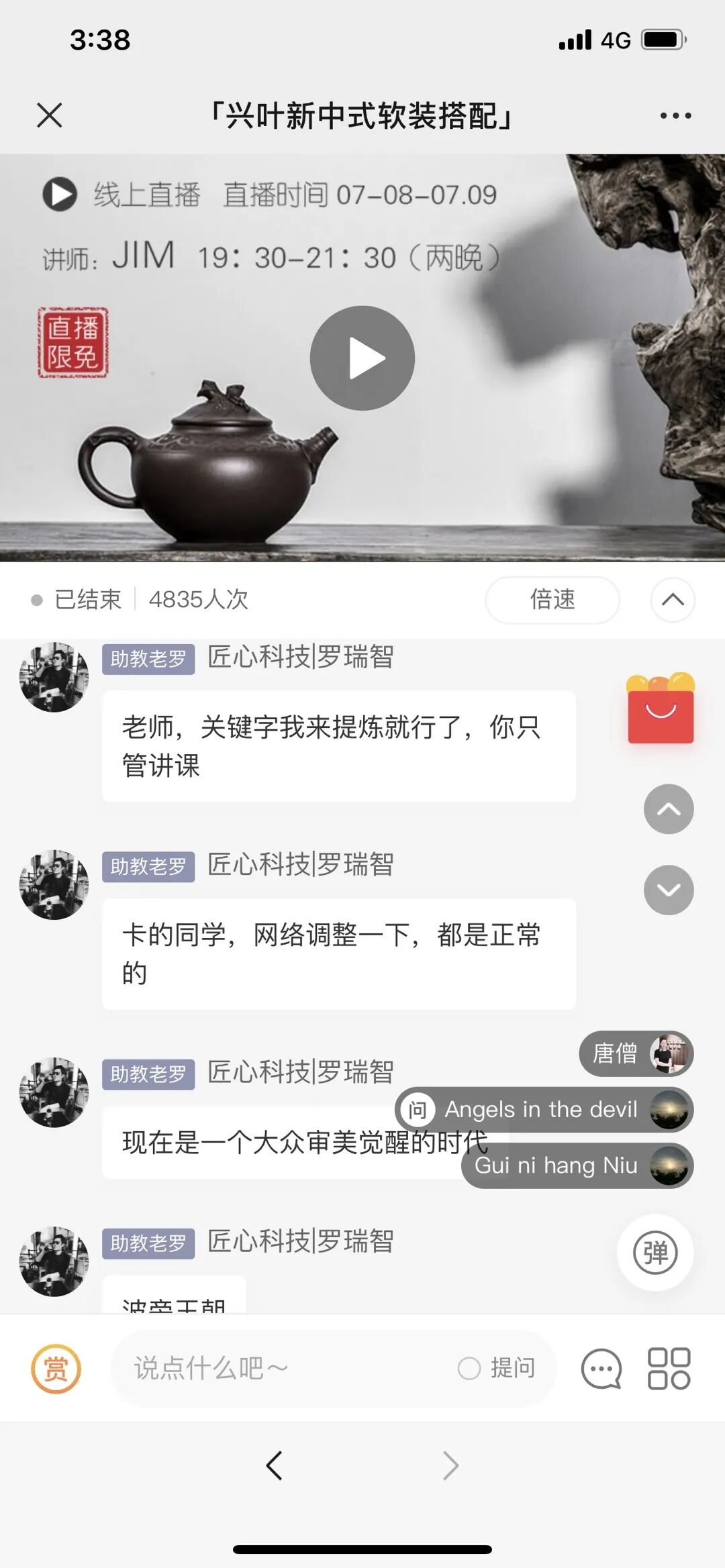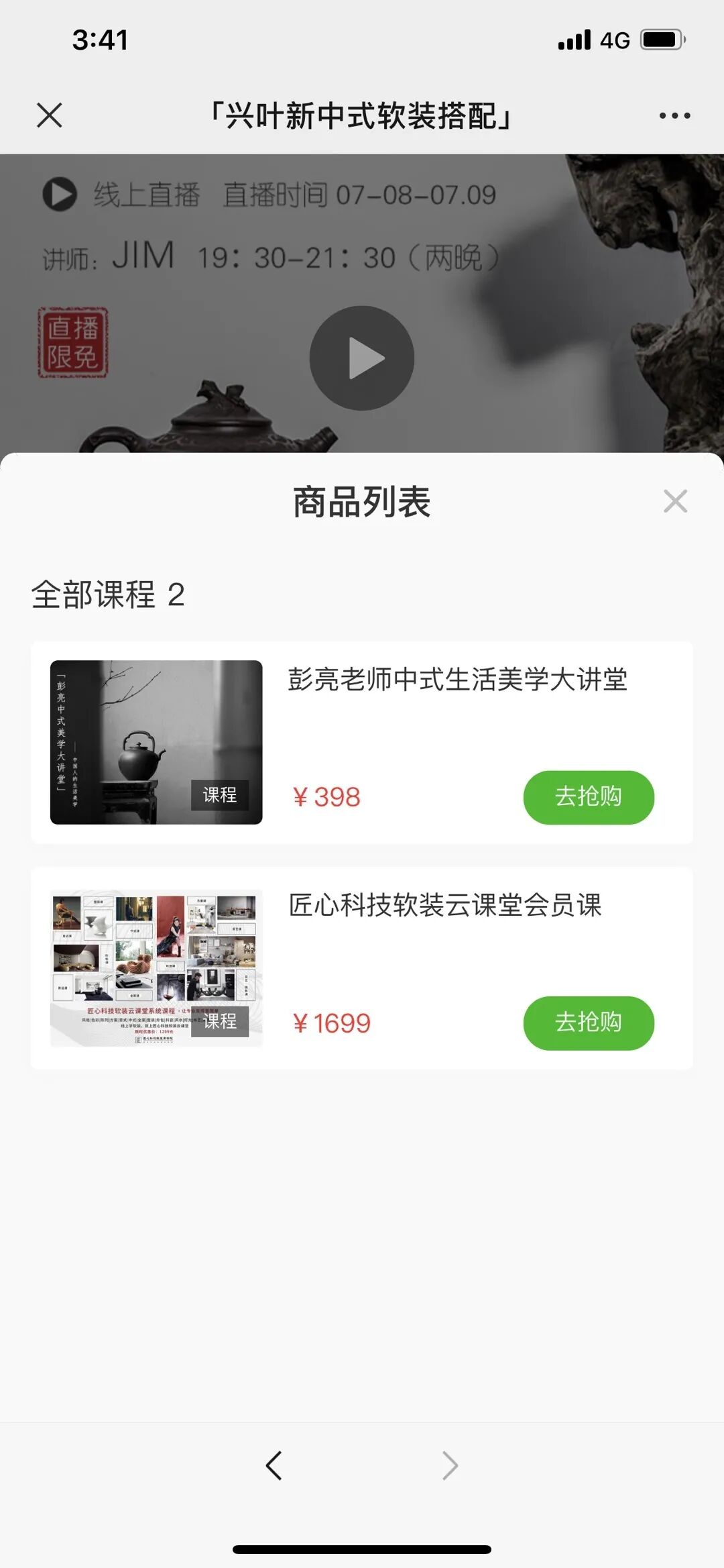 当直播正式开始,「匠心软装商学院」加入的直播带货功能就起作用,鲜艳的购物入口可以吸引学员点击抢购。